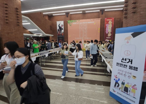이날 구미시문화예술회관에서는 행정안전부 주관으로 제21대 대통령선거의 원활한 선거사무 추진을 위한 선거담당 지방공무원 교육이 개최되었으며, 경상북도선거관리위원회는 이 계기를 활용하여‘선거현장의 히어로, 여러분을 응원합니다’라는 문구가 적힌 음료를 제공하면서 선거담당 지방공무원들과 발전적 파트너십을 형성하는 시간을 가졌다.