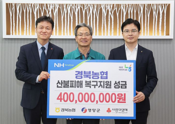 농협중앙회와 경북지역본부가 경북 영양군의 산불 피해 복구를 위해 성금 4억 원을 기탁했다. 전달된 성금은 피해 주민들의 일상 회복과 복구 지원에 사용될 예정이다.
