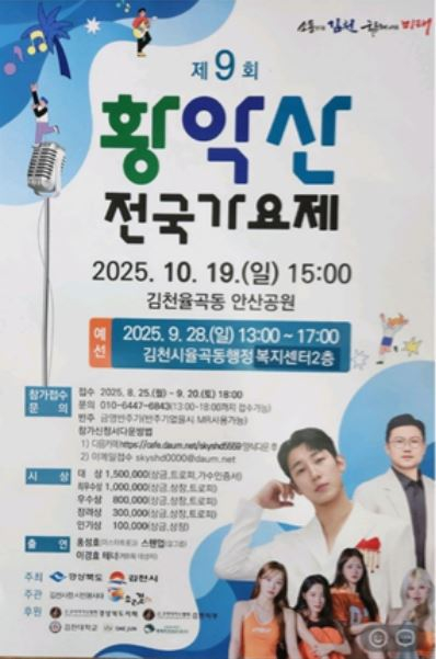 주최 측은 “황악산 전국가요제는 시민 모두가 함께하는 음악 축제이자, 김천의 대표적인 가을 문화행사”라며 많은 참여를 당부했다.