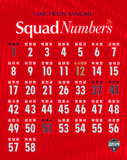 미드필더의 상징 8번은 김이석이 차지한다. 이건희는 공격수를 상징하는 9번을 골랐고, ‘에이스’를 상징하는 10번은 전병관의 몫이다. 지난 시즌 K리그1에서 가장 많은 공격포인트를 만들었던 김천상무의 14번은 박세진이 물려받았다. 김주찬은 측면 공격수가 주로 사용하는 17번을 달았다. 박태준이 원소속팀에서 사용하던 55번을 선택한 것도 눈에 띈다.