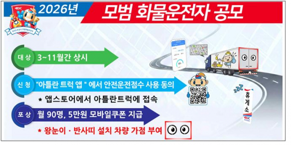 □ 한국도로공사(사장 직무대행 이상재)는 화물차 운전자들의 자발적인 안전운전을 유도하기 위해 2026년 모범 화물운전자*를 선발한다고 밝혔다.