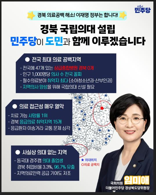 더불어민주당 경상북도당 위원장인 임미애 국회의원이 경북 지역의 숙원 사업인 ‘국립의과대학 설립’을 위해 대통령과 주무 부처 장관을 잇달아 만나는 광폭 행보를 펼치는 한편 도민과 함께하는 본격적인 홍보 캠페인에 돌입했다.