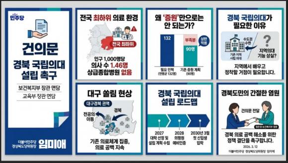 임 의원은 “지방 소멸은 곧 의료 소멸로부터 시작된다”며 “경북 북부권에 국립의대를 설립하는 것은 국가균형발전과 도민 생명권을 지키기 위한 필수 과제”라고 밝혔다. 이어 “도민 여러분께서 직접 홍보대사가 되어 의원실에서 제공하는 홍보물을 활용하여 경북의 절박한 염원을 전국에 확산시켜 주시길 간절히 바란다”고 덧붙였다.