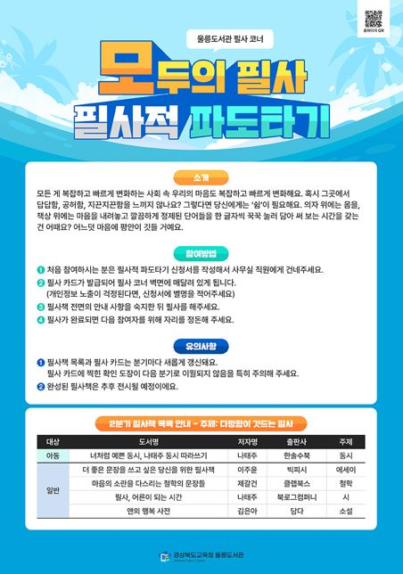 □ 경상북도교육청 울릉도서관(관장 김일영)은 도서관 1층 로비에 새롭게 조성된 필사 코너에서 진행되는 『필사적 파도타기』 참여자를 모집한다.