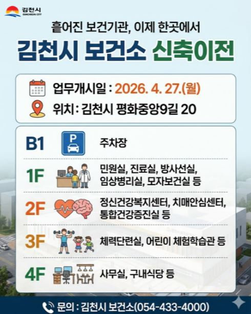 김천시는 시민 중심의 원스톱 보건의료서비스 제공을 위해 신축한 「김천시 보건소」를 오는 4월 27일 개소한다고 밝혔다.