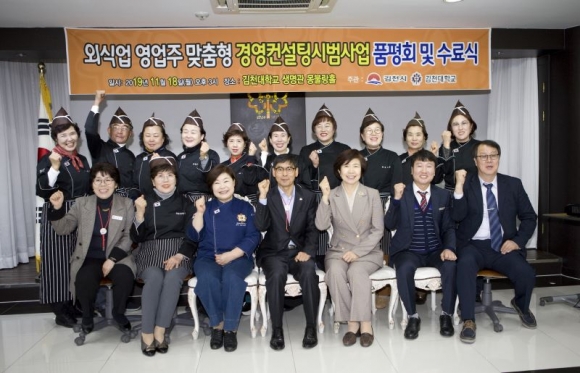 김천시(시장 김충섭)는 지난 11월 18일 오후3시 김천대학교 몽블랑홀에서 직지사 상가 영업주 11명과 김천대학교 윤옥현총장과 윤희숙 요리연구가 등이 참석한 가운데 외식업 영업주 경영컨설팅 수료식과 품평회를 가졌다.
