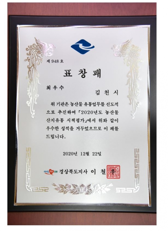 김천시(시장 김충섭)는 경상북도에서 주관하여 실시한 “2020년 제1회 농산물 산지유통 시책평가”에서 최우수상을 수상했다고 밝혔다.경북도내 23개 시·군을 대상으로 실시한 이번 농산물 산지유통 시책평가는 농산물 통합마케팅 및 도단위 통합브랜드 육성에 대한 시군 추진상황을 평가하여 우수 시책 발굴․전파 및 농산물 산지유통구조 개선을 촉진하기 위해 올해 처음으로 실시되었다.