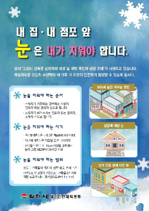 김천시(시장 김충섭)는 겨울철 폭설로 인한 시민의 인명 및 재산피해를 줄이는 방안으로 시민 스스로 방재의식 고취와 안전을 확보하기 위한 ‘내 집, 내 점포 앞 눈치우기’집중 홍보에 나섰다. 시에서는 겨울철 시민의 안전사고 예방과 불편을 최소화하기 위해 겨울철 도로 제설·제빙 대책을 수립하여 주요 간선 도로 등 차량 통행이 잦은 도로는 행정력을 동원해 집중 제설 작업을 실시한다. 또한 이면도로 및 집 앞 골목길 보도 등은‘내 집, 내 점포 앞 눈치우기’관련 조례에 따라 건축물 소유자, 점유자 또는 관리자는 주간에 눈이 그친 경우 4시간 이내, 야간에 눈이 그친 경우 다음 날 오전 11시까지 건축물의 대지에 접한 보도의 전체 구간 등에 대한 제설 작업을 해야 한다. 이에 따라 홍보물 2만부를 제작해 마을회관, 주민센터 등 다중이용시설에 비치하고 홈페이지 및 재해문자전광판 등을 통해 집중 홍보 할 계획이다.시 관계자는 “겨울철 자연재난으로 인명 및 재산 피해가 발생하지 않도록 성숙한 주인의식으로 내 집, 내 점포 앞 눈치우기 운동에 적극 협조해 주시길 부탁드린다.”고 말했다.