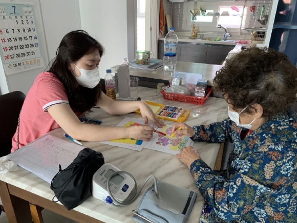 □ ‘사회적 거리 YES, 사회적 고립 NO’ 일대일 가정방문을 통한 프로그램 내실화김천시는 코로나19가 장기화되면서 치매환자쉼터를 한시적으로 일대일 가정방문 서비스로 변경하여 「가가호호 방문서비스」를 운영하였다.107명의 치매어르신을 대상으로 돌봄공백 최소화를 위해 주기적인 안부 전화, 콩나물 및 방울토마토 키우기 꾸러미를 제공함으로써 사회적 고립 및 정서적 지지를 도모하였다. 치매고위험군 20명을 대상으로 태블릿을 활용한 인지재활프로그램 및 회상ㆍ작업ㆍ미술치료 등 다양한 프로그램을 제공하는 「두뇌톡!톡! 방문서비스」를 운영하였다.