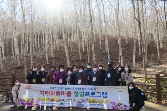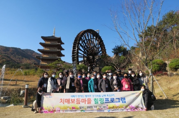 그리고 사회적 가족 문화를 만들기 위해 힐링프로그램 등 가족지원 사업을 운영하여, 지난 11월 10일 치매어르신 및 가족을 포함한 마을주민이 국립김천치유의숲, 김천시 사명대사공원과 연계하여 산림 치유 프로그램 및 한복체험, 평화의 탑 관광 등 나들이를 다녀왔다. 그 밖에도 마을회관 환경개선, 장수사진 촬영 등 다양한 사업을 실시하여 공동체 의식을 더욱 단단하게 하고, 치매어르신 돌봄문화 확산을 위한 계기의 장을 제공한다. □ 지역사회 자원 연계 및 기관 협력 확대치매안심센터를 주축으로 치매 관련 전문가 및 유관 기관·단체로 구성된 지역사회협의체를 운영하여 치매정책사업의 발전방향을 제시하고, 민·관 협력적 파트너십 및 연계 시스템을 구축하여 치매 사각지대 없이 치매어르신과 가족에게 적절한 보건·복지 서비스를 점차 확대·지원하고 있다.공공부문으로 김천시청 공무원 봉사동아리 우함나회 후원 물품(쌀 20kg, 라면 1박스)부터 중앙보건지소 무료의치(틀니) 지원서비스, 김천노인복지센터 재가노인지원서비스를 연계하였다.