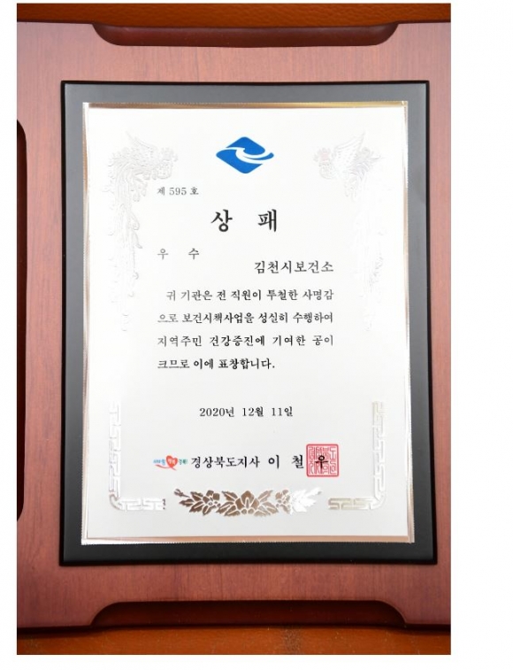 김천시(시장 김충섭)은 경상북도에서 실시한 2020년 보건시책사업 평가에서‘우수상’을 수상하였다.