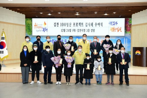 김천시에서 실시한 2020년 김천 100명산 프로젝트가 성공리에 마무리 되었다. 김천시(시장 김충섭)는 김천 100명산 프로젝트 행사 홍보에 힘써주시고, 적극적으로 참여해 주신 공로 민간인 8명을 대상으로 감사패를 수여하였다.이날 수상자는 명산 홍보와 산지정화활동에 적극적으로 활동한 정소화, 이규홍, 장애인종합복지관 바람산악회, 한국전력기술 산악회, 강경률 가족, 조재영 가족, 차다혜 가족, 권도윤 가족 이다.김천 100명산 프로젝트는 우리고장의 아름다운 명산을 널리 알리기 위한 행사이며, 김천에서 지정한 100개의 명산 중 성인 70개, 학생 30개 이상의 산을 완등한 도전자분들에게 기념인증서를 수여하는 행사이다.2020년 김천 100명산 프로젝트 참가 신청자는 총 973명이며, 김천 614명, 대구 202명, 구미 92명, 예천포항울산 등 기타지역에서 65명이 신청을 하였다. 신청자들 중 완등인증서를 받으시는 분은 총 113명이다.김천시장 김충섭은 이날 행사에서 “행사가 성공리에 마무리 될 수 있게 도움을 주신분들께 감사하며, 많은 분들의 도움 덕분에 김천 100명산 프로젝트가 성공리에 마무리 될 수 있었다. 앞으로도 많은 관광객들이 김천의 100명산을 찾을 수 있게 많은 홍보 부탁드린다.”며, “코로나 19로 어려운 상황에도 행사에 참석해주신 분들께 감사드리며, 관내 코로나 확진자가 발생하고 있는 상황에 많은분들이 거리두기에 적극 협조해 주셔서 하루빨리 김천에 코로나가 종식되기를 바라며, 많은 협조 부탁드린다”고 전했다.