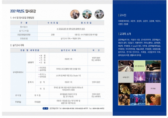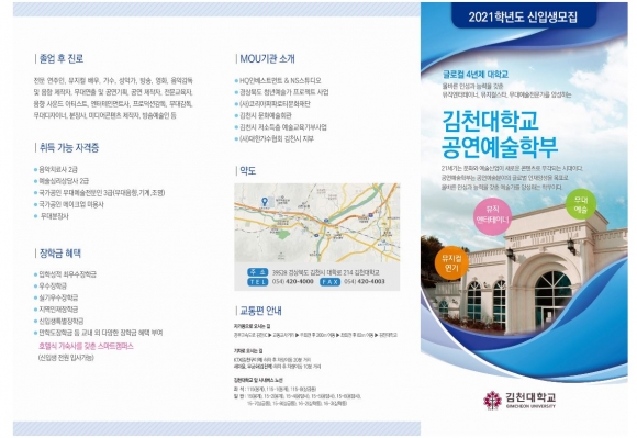 김천대학교 관계자는 “공연예술학부는 우수한 공연엔터테이너를 양성하기 위해 최선의 노력을 기울이고 있다”며 “졸업 후 뮤지션, 뮤지컬 배우, 무대 및 음향감독 및 분장디자이너 등 전문분야는 물론 중등음악교사와 음악치료사 등 다양한 분야로 진출할 수 있도록 교육하고 한다. 앞으로도 공연예술학부에서 많은 인재가 탄생할 수 있도록 지원을 아끼지 않겠다.”고 전했으며, 2021년도 신입생 정시모집은 2021년1월 7일부터 1월11일까지이다.