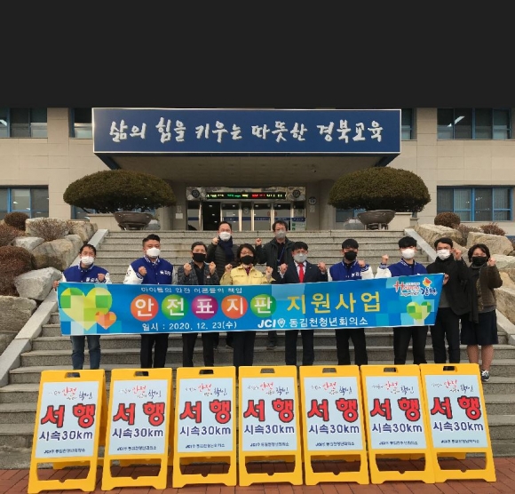 이번에 보급한 교통안전표지판은 동김천청년회의소(회장 손영재)에서 우리 지역 교육기부사업의 일환으로 100개를 제작하여 김천교육지원청에 기부한 물품이다. 특히 ‘아이들의 안전 어른들의 책임’이라는 슬로건을 바탕으로 제작한 이번 표지판은 학교 앞 횡단보도와 어린이 보호구역에서 운전자가 쉽게 확인할 수 있도록 엘로우 색상의 표지판에 레드 색상의 ‘서행 30km’글씨가 들어가 있어 교통사고 예방 및 교통안전문화 확립에도 크게 기여할 것으로 기대하고 있다. 손 회장은 “우리 회원 모두의 따뜻한 마음과 정성으로 이번 사업을 시작하였다.”며 “앞으로도 우리 지역 미래의 일꾼인 학생들의 교육환경을 개선하기 위하여 노력하겠다.”라고 말했다. 마숙자 교육장은 “우리 지역 아이들의 안전을 위하여 노력을 아끼지 않는 동김천청년회의소 모든 회원들에게 깊은 감사를 드리며, 앞으로도 우리 지역 학생들이 좋은 환경에서 학교에 다닐 수 있도록 많은 관심을 부탁드린다.”며 “학생들이 마음 놓고 학교를 다닐 수 있는 환경은 안전에서부터 출발하여야 하는데 이번 안전표지판 보급은 그러한 면에서 큰 의미가 있다.”라고 말하였다.