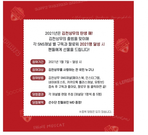 김천상무프로축구단의 SNS 채널 접속 후 구독, 좋아요, 팔로우 등을 클릭하면 된다. 참여기간은 1월 7일부터 달성 시까지이며 참여대상은 김천상무를 사랑하는 전 국민이다. 각 채널 별 팔로워 2021 달성 시 채널 당 한 명 씩 랜덤 추첨해 선수단 친필싸인 MD를 증정한다. 한편, 김천상무프로축구단은 공식 홈페이지를 오픈해 본격적인 온라인 홍보에 돌입했다.