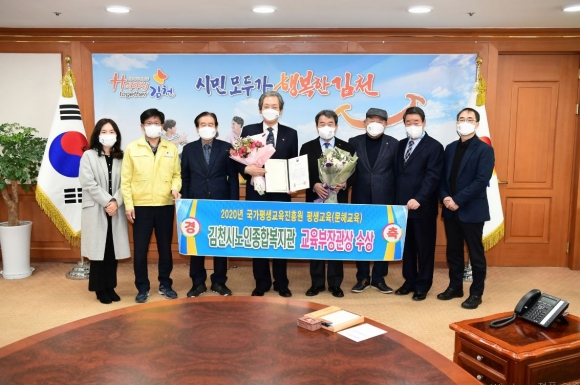 김천시노인종합복지관(관장 정재춘)은 국가평생교육진흥원에서 실시하는 2020년 평생교육(문해교육) 유공 기관 표창에서 교육부장관상을 수상하였다.이번 표창은 문해 교육 지원 및 활성화에 기여한 공이 있는 자를 발굴하여 사기진작과 우수 사례를 전파하기 위한 목적으로 국가평생교육진흥원에서 전국에 20개 기관(개인)을 선정하여 수여하는 것이다.