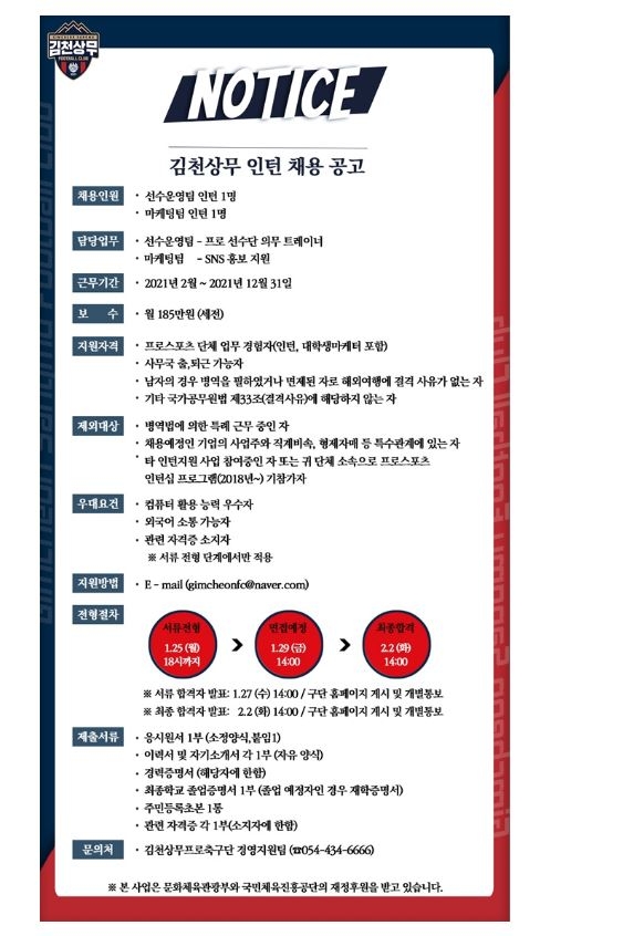 gimcheonfc@naver.com)을 통해서만 가능하다. 서류 합격자는 27일(수) 오후 2시에 구단 홈페이지 게시 및 개별 통보하며 면접 예정일은 29일(금) 오후 2시다. 최종합격자 발표는 2월 2일(화) 오후 2시로 구단 홈페이지 게시 및 개별 통보한다. 자세한 사항은 김천상무프로축구단 공식 홈페이지(www.gimcheonfc.com) 공지사항에서 확인할 수 있으며 기타 문의사항은 사무국 경영지원팀(☎054-434-6666)으로 연락하면 된다. 한편, 신규 인턴 채용은 문화체육관광부와 국민체육진흥공단의 재정 후원으로 진행된다.