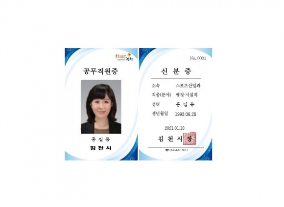 김천시(시장 김충섭)는 18일 김천시 소속 공무직근로자에게 새로 제작한 공무직원증 291개를 배부했다. 기존의 공무직원증은 발급된 지 오래되었고, 발급년도에 따라 디자인이 제각각이여서 공무직근로자의 신분을 확인하기 어려웠다. 이에 김천시는 「김천시 공무직근로자 및 기간제근로자 인사관리규정」에 통일된 공무직원증의 디자인을 명시하였으며, 이에 따라 새로운 공무직원증을 제작하여 김천시 소속 전 공무직근로자에게 배부하였다.새로 만들어진 공무직원증에는 시민이 행복한 김천을 상징하는 ‘해피투게더’로고가 들어가 대민 행정서비스 향상을 위한 마음가짐을 담았으며, 직종을 명시하여 어떤 업무에 종사하는지 구분이 가도록 하였다.공무직원증을 받은 공무직근로자들은 “공무직원증을 받으니 김천시 소속 직원이라는 것이 새삼 실감난다. 책임의식이 생긴다.”, “새 공무직원증을 받으니 마음가짐도 새롭게 다잡게 된다. 김천시 소속 공무직근로자로서 시민들의 행복을 위해 더욱 친절하게 열심히 일해야겠다.”며 소감을 밝혔다.김충섭 김천시장은 “이번 공무직원증 발급을 통해 공무직원도 김천시의 일원으로서 책임감과 자긍심을 갖길 바란다. 공무직원들의 사기가 올라가 행정서비스 질의 향상으로 이어지면 좋겠다.”고 말했다.