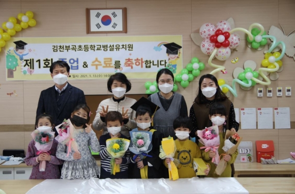 2021년 1월 13일(수) 김천부곡초등학교병설유치원(원장 김경숙)은 수료식과 제1회 졸업식을 실시하였다. 2020년 9월 개원한 김천부곡초등학교병설유치원의 첫 졸업식을 하는 뜻깊은 날, 먼저 김천부곡초등학교 밴드부가 준비한 신나는 공연과 함께하는 축하의 시간을 가졌다. 참석자 모두 마스크를 착용하고 입실 전 발열 체크와 손 소독을 실시하여 혹시 모를 감염원을 미연에 차단해서 안전하고 즐거운 행사를 진행하였다. 김천부곡초등학교병설유치원 김경숙 원장은 “김천부곡초병설유치원의 첫 졸업이 있기까지 학부모님의 큰 관심과 지원에 감사합니다. 한 아이를 키워내는 데 온 마을의 힘이 필요하다는 아프리카 속담처럼, 김천부곡초병설유치원 선생님들과 학부모님들이 한 마을이 되어 우리 아이들이 밝고 건강하게 자라 날 수 있는 힘이 되었다고 생각합니다. 시작은 미약하지만 2대, 3대를 거쳐 앞으로 더욱 발전해 나가는 김천부곡초병설유치원이 되도록 함께 노력해가겠습니다. 어린이 여러분, 졸업을 진심으로 축하합니다. 학부모님, 고맙습니다.”라며 축하와 감사의 말씀을 전하였다. 이날 제1회 수료식과 졸업식에서는 유치원 원생들의 유치원 생활을 칭찬하고 격려하는 상장과 상품을 수여하였고, 원생들과 선생님이 준비한 축하 영상과 행복했던 유치원 생활을 동영상으로 되돌아보는 시간을 가지며 첫 졸업식의 감동을 더했다. 유아들은 사랑으로 교육해주신 선생님과 부모님께 감사의 인사를 드리고 마지막으로 그동안 함께 지낸 형님들을 떠나보내는 아쉬운 마음과 동생들과 함께했던 지난 시간을 추억하는 마음을 담아 송별가와 졸업가를 힘차게 제창하며 큰 박수와 함께 작지만 의미 있는 김천부곡초등학교병설유치원 졸업식의 막을 내렸다. 졸업식에 참석한 학부모는 “우리 아이가 의젓하게 졸업식을 하는 모습을 보니 감격스럽습니다. 그동안 선생님들 수고가 많으셨습니다. 감사합니다.”라고 소감을 밝혔다. 2021년 1월 13일 제1회 졸업식을 개최한 김천부곡초등학교병설유치원은 앞으로도 웃음과 사랑이 가득한 행복한 유치원을 만들며 더욱 발전해나갈 수 있도록 최선을 다할 계획이다.