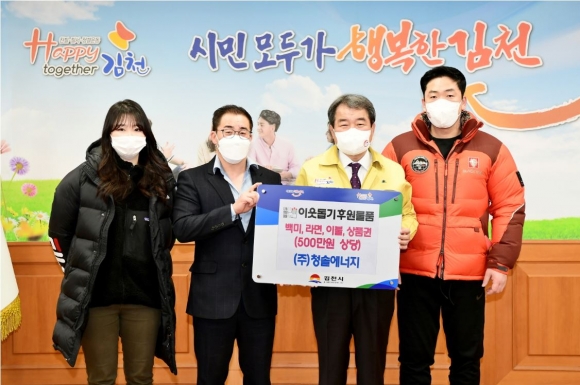 주식회사 청솔에너지(대표 최성필)는 지난 18일 김천시청을 찾아 500만원 상당의 생필품 25세트를 전달했다.후원물품은 겨울이불, 라면, 백미10kg, 김천사랑상품권(5만원)으로 관내 저소득 가구 25세대에 지원될 예정이다.최성필 대표는 “추운 겨울, 우리 주변의 어려운 이웃들에게 따뜻한 나눔을 주고 싶어 준비하게 되었다. 앞으로도 지속적인 나눔으로 김천시와 함께 성장하는 기업이 되도록 노력할 것.”이라고 말했다.김충섭 김천시장은 “어려운 경기에도 불구하고 이웃을 위해 나눔을 실천해주시는 ㈜청솔에너지에 깊은 감사를 드린다. 전해주신 물품은 정성을 담아 도움이 필요한 곳에 잘 전달하겠다.”며 감사의 인사를 전했다.한편 김천시 모암동에 위치한 ㈜청솔에너지는 신재생에너지 태양광에 관련된 RPS 사업을 컨설팅 인허가, 시공설치, 구조물 설치 및 총괄업무를 시행하는 태양광발전개발전문기업으로 2020년에도 1,000만원 상당의 생필품을 기부하는 등 매년 지속적으로 나눔에 함께 하고 있다.