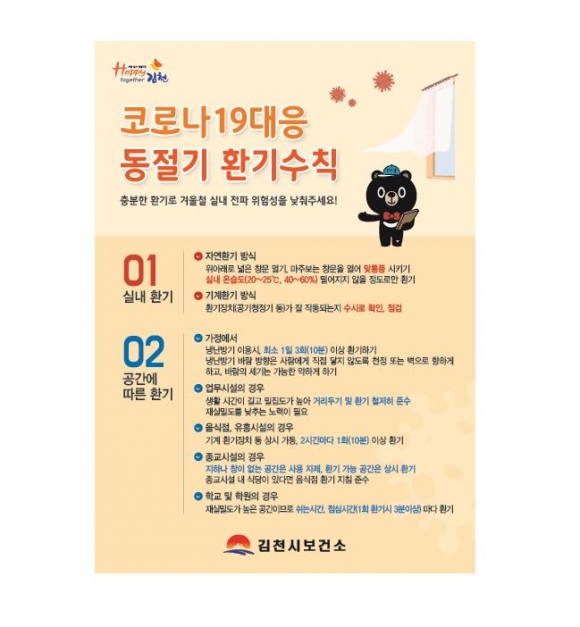 김천시는 겨울철 밀폐된 환경으로 인한 코로나19 확산 위험이 커짐에 따라 실내 환기와 개인방역 수칙의 중요성을 알리고자 시민들에게 코로나19 동절기 환기지침 및 마스크 착용 등 개인방역 수칙 홍보에 나섰다.김천시는 최근 밀폐된 공간에서 함께 생활하는 가족, 지인간의 감염사례가 지속적으로 발생하고 있음에 따라 가정 내 철저한 방역수칙 준수를 당부하는 한편, 가정 내 방역 대응에 주안점을 두고 시민의 적극적인 참여를 호소하고 있다.김천시 관계자는“가정 내에서도 마스크 쓰기, 손 씻기, 음식 덜어먹기 특히,코로나19의 대표적 감염 취약 요인인 밀폐․밀집․밀접 중 밀폐의 경우 최소 1일 3회(10분)이상 환기를 통해 개선이 가능하므로 주기적인 실내 환기가 무엇보다 중요하다.”고 강조했다.김충섭 김천시장은“코로나19 확산세가 다소 누그러졌다고는 하나 겨울철이라는 계절 요인과 함께 변이 바이러스 등의 새로운 변수도 부상한 터라 긴장의 끈을 놓을 수 없는 상황”이라며,“시민 여러분께서도 사랑하는 가족을 위해 가정 내 방역수칙 준수에 한마음 한뜻으로 동참해 주시길 부탁드린다”고 전했다.김천시는 코로나19 지역사회 전파를 차단하기 위하여 의심환자 발생시 선제적 검사 실시, 신속한 사례 및 역학조사로 연결고리를 사전 차단하는 등 총력을 기울이고 있다.