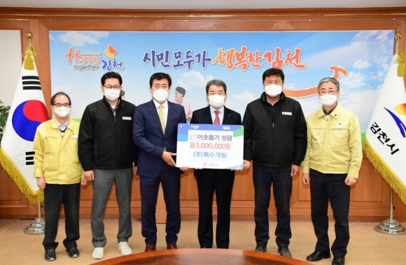 주식회사 특수개발(대표 오장호)는 지난 21일 김천시청을 방문하여 어려운 이웃들을 위해 써달라며 300만원의 이웃돕기 성금을 전달했다.오장호 대표는 “코로나19로 모두가 어려운 시기 이지만 우리 지역의 어려운 이웃들이 소외받지 않기를 바라며 성금을 전달하게 되었다. 앞으로도 나눔을 통해 사회적 책임을 다하는 기업이 되도록 노력하겠다.”고 말했다. 김충섭 김천시장은 “어려운 상황 속에서도 이웃 사랑에 참여해 주신 ㈜특수개발 오장호 대표님께 깊은 감사를 드린다. 전달받은 성금은 어려운 이웃을 위해 꼭 필요한 곳에 사용하겠다.”고 전했다.한편, 김천시 대신동에 위치한 ㈜특수개발은 토목공사, 건축공사, 토공사업 등을 하는 토공사업체로 수년 전부터 이웃돕기 성금 전달에 참여하며 나눔을 실천하고 있다. 기탁된 성금은 경북사회복지공동모금회를 통해 추운 겨울을 힘들게 보내고 있을 관내 어려운 이웃들에게 다양한 사업으로 지원될 예정이다.