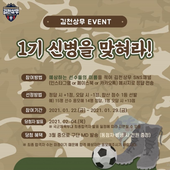 김천상무프로축구단이 실시하는 ‘1기 신병을 맞혀라’ 이벤트 참여하고 구단 MD 받자!