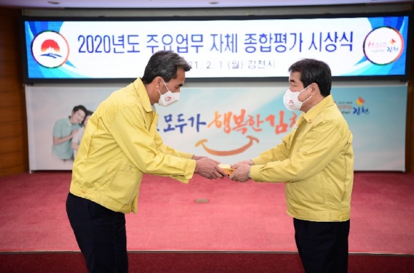 김천시(시장 김충섭)는 2020년 주요업무 자체 종합평가 심의회를 개최하고 성과관리시스템(BSC) 업무 실적과 부서별 역점시책, 기관평가 수상 실적 등 1년간의 성과를 평가하여 실적이 뛰어난 우수부서 및 우수공무원을 선정한 결과를 발표하였다.2020년 최우수 부서는‘코로나19 경기 활성화 생!생!생! 프로젝트 추진’, ‘김천시 온라인 일자리박람회 및 소상공인 특례보증 지원(500억 규모)’등으로 코로나19 극복 민생·경제회복에 기여한 일자리경제과가 선정 되었으며,우수 부서는 ‘비대면 건강운동 프로그램 추진 및 산모ㆍ아기 돌봄 100일 대작전 시행’으로 시민 건강과 면역력증진, 산모·아기돌봄 서비스에 노력한 건강증진과와‘김천시 지역정보화 기본계획 수립’, ‘버스 공공 와이파이 구축 및 스마트시티 통합플랫폼 운영’으로 급속하게 변화하는 정보화 환경에 능동적인 대처로 지역발전에 기여한 정보기획과 2개 부서에 돌아갔다.장려는‘지하수 방치공 조사 복구 사업’,‘미세먼지 저감으로 기후변화 대응’을 추진한 환경위생과,‘코로나19 드라이브스루 선별진료소 운영’, ‘의료 취약지 비대면 ICT 진료사업’등을 추진한 보건행정과, ‘시가지 내 노후 우수관로 정비’,‘지방상수도 개인급수공사로 시가지 환경개선’에 기여한 상하수도과가 선정되었다.시정추진 최우수 공무원은‘신산업단지 조성 전 조기분양 추진’,‘국내복귀기업 투자 유치 및 국도비 확보’와 ‘총 19개사 3,046억원, 신규고용인원 1,580명의 투자양해각서를 체결’하는데 노력을 기울여 기업유치, 지역일자리창출 기반 확충에 공헌한 투자유치과 장성업 주무관이 선정되었으며,우수 공무원은 ‘소상공인 일자리 창출 지원사업’,‘코로나19 지역고용대응 특별지원사업 및 공공 일자리사업 추진’등 일자리 지원 사업에 기여한 일자리경제과 이혜정 팀장, ‘배수개선사업 국비 99억 확보’, ‘농업기반시설 확충‧정비사업 추진’ 등에 성과를 거둔 건설도시과 장임석 팀장과 ‘드라이브 스루 안심도서예약 대출 서비스’, ‘지혜로운 집콕 생활 운영’으로 코로나19 블루 극복을 위한 도서행정 추진에 노력한 시립도서관 김현주 주무관이 선정되었다.김충섭 시장은 “코로나 19로 인해 소상공인 등 시민뿐만 아니라 관계 공무원들도 힘든 시기를 보내고 있다. 그럼에도 각 분야 직무에 최선을 다해 역대 최대 대외 수상실적 성과를 거둔 직원들이 자랑스럽고, 그간의 노고에 감사드린다. 금년에도 부서 간 선의의 경쟁을 통하여 시민들에게 질 높은 행정서비스를 제공하고, 소통하는 열린 행정으로 시민모두가 행복한 Happy together 김천을 만들어 가는데 최선을 다하겠다.”고 말했다.