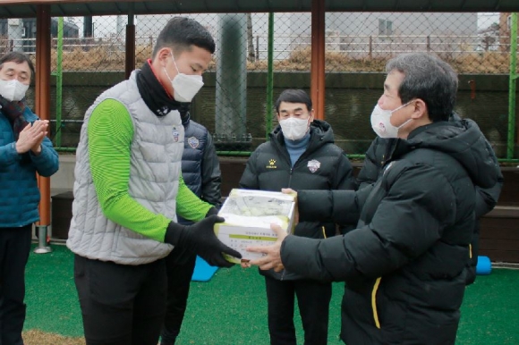 김천상무프로축구단 김충섭 구단주가 지난 1일 부산 기장에 방문해 선수단을 격려했다. 구단주 김충섭 김천시장을 비롯해 배낙호 대표이사, 이흥실 단장, 최한동 후원회장이 함께 격려 방문했다. 김충섭 구단주는 바쁜 시정에도 불구하고 선수단 상견례 및 격려 후 훈련까지 직접 참관했다. 김충섭 구단주는 “김천은 소도시지만 김천 시민의 축구에 대한 열의는 대단하다. 김천은 명실상부한 스포츠 도시로 프로축구단까지 유치하게 됐다. 올 시즌 그라운드에서 최선을 다해 시민 모두가 원하는 K리그1 승격을 달성하기 바란다”고 전했다. 김태완 감독은 “어려운 시국 속에서 시장님께서 직접 격려 방문까지 와주셔서 정말 감사하다. 동계훈련을 통해 전술, 조직력을 잘 갖춰 개막 후 팬분들의 눈을 즐겁게 하는 축구를 하겠다. 김천상무에 대한 많은 관심 부탁드린다”고 말했다. 한편, 이번 선수단 격려 방문은 철저히 방역 수칙을 준수하며 진행됐으며 선수단은 전지훈련 숙소 밖 외출 금지, 식사 시 개인 테이블 사용 등 생활 속 방역을 준수하며 전지훈련에 임하고 있다.