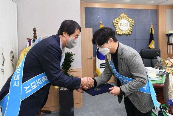 김천시의회(의장 이우청)는 3일 오후 의장실에서 의장단이 참여한 가운데 가수 박구윤씨를 김천시의회 홍보대사로 위촉했다. 김천시의회에서는 시민과의 소통을 강화하고 좀더 친근감있게 다가가는 의회 이미지 제고와 효율적인 의정활동의 홍보를 위하여 홍보대사를 선정하고 있으며 홍보대사는 임기 2년간 김천시의회를 위해서 활동한다이번에 위촉된 가수 박구윤씨는 노래방 애창곡 1위에 선정되기도 한 ‘뿐이고’,‘나무꾼’ 등의 히트곡으로 널리 알려져 있으며 트로트 열풍으로 바쁜 스케줄에도 불구하고 김천시의회 홍보대사 활동에 적극 협조한다는 뜻을 밝혔다.