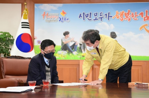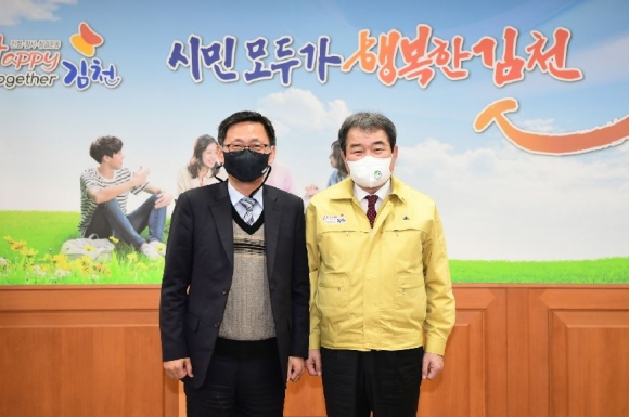 김충섭 김천시장은 4일, 김천시를 방문한 구헌상 부산지방국토관리청장과 면담을 갖고 지연 현안에 대한 다양한 의견을 나누었다.부산지방국토관리청에서 시행중인 옥률~대룡간 국도대체 우회도로 개설사업의 현장 점검과 정부 핵심과제인 교통사고 줄이기의 자치단체 협조를 유도하기 위해 김천시를 방문한 구헌상 청장은, 정부와 지방자치단체간 긴밀한 협조로 국민들이 안전하게 도로를 이용할 수 있도록 김천시의 역할을 강조하였으며 현재 시행중인 옥률~대룡간 국도대체우회도로 개설사업, 국도 59호, 국도3호선 확장사업 등이 순조롭게 추진되고 있으며 목표연도에 사업이 준공될 수 있도록 최대한 노력하겠다고 밝혔다.