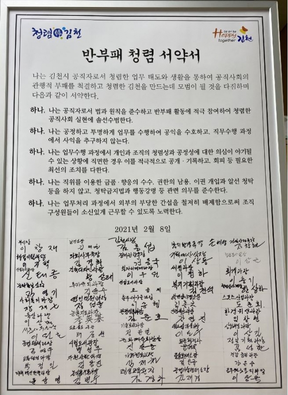 대책협의회는 ‘2021년도 김천시 청렴도 향상 종합계획’을 공유하며 2개월마다 청렴도 향상 대책 추진상황을 점검하고 추진결과를 평가한다.이번 회의에서는 올해 추진하게 되는 청렴도 향상 종합계획과 부서별로 청렴도 향상 대책에 대한 발표와 토론하는 시간을 가졌으며, 청렴의지를 다지는 ‘반부패 청렴 서약서’에 간부공무원 모두 서명했다.회의를 주재한 이 부시장은 “최근 김천시는 낮은 청렴도 등급으로 공직사회의 사기도 많이 떨어져있고, 시민들이 시를 바라보는 눈길도 곱지만은 않은 상황이다.