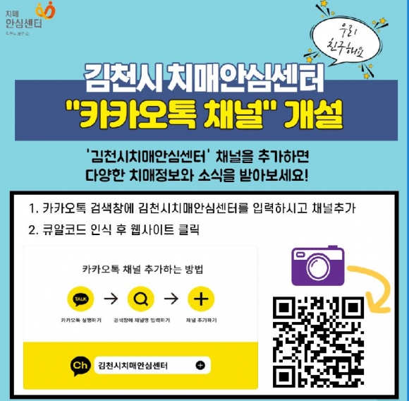 김천시 치매안심센터는 치매인식개선 홍보 및 소통을 위해 ‘카카오톡 채널’을 2월 22일부터 개설하여 운영할 예정이다.카카오톡 채널은 전 국민이 사용하는 메신저인 카카오톡에서 운영하는 서비스로 누구나 손쉽게 카카오톡에서‘김천시치매안심센터’를 검색해 채널을 추가하고 치매안심센터 소식 및 정보를 받아 볼 수 있다.카카오톡 채널 개설 홍보를 위해 3월부터 5월까지 채널 가입 이벤트로카카오톡에서 김천시치매안심센터 채널을 추가하고“안녕하세요”메세지를 보내면 참여할 수 있으며 가입 이벤트는 3개월간 진행되며 매월 선착순 20명에게 기념품을 제공할 예정이다.카카오톡 채널을 통해 치매안심센터 소식 및 치매관련 정보뿐만 아니라 1대1 채팅 기능을 활용하여 치매안심센터 서비스 내용을 즉시 확인할 수 있다. 또한‘슬기로운 기억력 생활’인지자극 프로그램을 제공하여 지역 주민들의 인지 건강 향상에 기여할 것으로 기대된다.김천시장(김충섭)은 “카카오톡 채널 운영으로 많은 시민들이 채널에 가입하여 김천시 치매안심센터에서 제공하는 다양한 소식과 정보제공으로 많은 시민들이 서비스 혜택을 누리길 바란다”고 말했다.