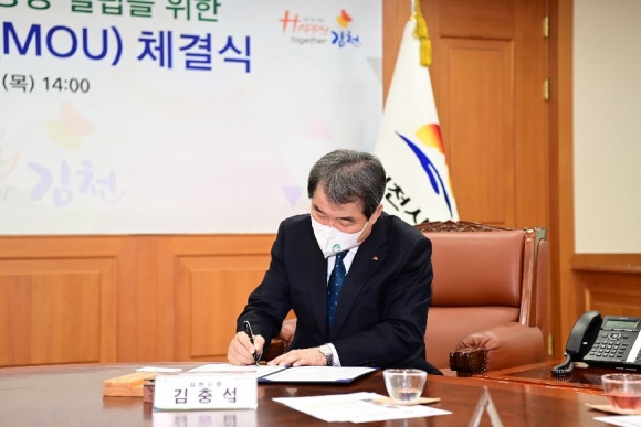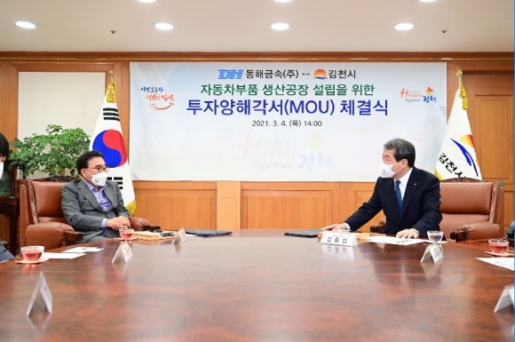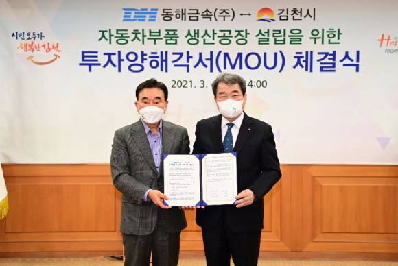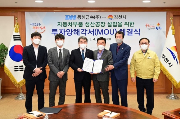 김천시(김천시장 김충섭)는 4일 오후 2시 김천시청 접견실에서 김충섭 김천시장, 이우청 시의회 의장, 동해금속㈜ 서동해 대표이사 등이 참석한 가운데 자동차 및 철도부품 생산 공장 설립을 위한 투자양해각서(MOU)를 체결했다.이번 투자협약은 김천일반산업단지(2단계)내 33,640㎡(10,000평)부지에 총 300억을 투자하여 자동차 및 철도부품 생산 공장을 건립 최소 100명 이상의 신규 일자리를 창출할 예정이다.