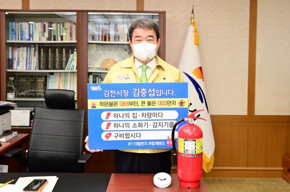 김충섭 김천시장은 3월 5일 주택용 소방시설인 화재감지기와 소화기의 중요성을 알리는 119 릴레이 챌린지에 동참했다.119 릴레이 챌린지는 작은 불은 대비부터, 큰불은 대피먼저라는 주제로 화재예방과 대처요령을 알리고, 특히 인명 및 재산 보호를 위해 소화기와 화재감지기 설치의 필요성을 강조하는 캠페인으로, 참여자가 메시지를 담은 사진을 SNS에 올린 뒤 다음 참여자 3명을 추천하는 릴레이 방식으로 진행된다.강임준 군산시장의 지명으로 릴레이 챌린지에 동참하였으며, 다음 참여자로 김철훈 부산시 영도구청장과 배기철 대구시 동구청장, 박삼봉 김천교육지원청장을 지명했다.김충섭 김천시장은 “코로나19로 가정에서 보내는 시간이 늘어난 만큼, 화재예방을 위하여 주택용 소화기와 화재감지기 설치에 동참하여 줄 것을 당부드리며, 안전한 김천시 만들기에 최선을 다하겠다.”고 말했다.그동안 시에서는 화재 예방을 위해 2018년 재난취약계층 지원에 관한 조례를 제정하여 2,700여 세대에 소화기를 배부하였으며, 올해는 1,000여 세대에 소방시설 지원사업을 시행할 계획이다.