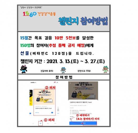 김천시는 시민들의 건강생활 실천을 돕기 위한 모바일 걷기 앱(워크온)을 활용한 ‘3월 챌린지’를 운영한다.이번 3월 챌린지는 3월 13일부터 3월 27일까지 목표걸음 10만 5천 보 이상(1일 최대 7천 보 인정) 달성자 중 추첨을 통해 150명을 선정, 선물을 증정할 예정이다.챌린지 참여를 위해서는 스마트폰 플레이스토어 또는 앱스토어에서 ‘워크온’ 설치 후 김천시 공식 커뮤니티(소 그룹 읍면동 선택) 가입, 김천시 챌린지에서 ‘참여하기’를 누른 후 휴대폰을 소지하고 걸으면 된다. 챌린지 기간 동안 목표 걸음 수 10만 5천보를 채우게 되면 자동 응모 되며 당첨자는 추첨을 통하여 3월말 워크온 앱 내 공지사항에 게시될 예정이다.김충섭 김천시장은 “3월에는 봄철 꽃샘추위와 큰 일교차로 체온 유지가 힘든 만큼 보온에 유의하시면서 건강 걷기를 실천해주시길 바란다.”고 당부하였다.