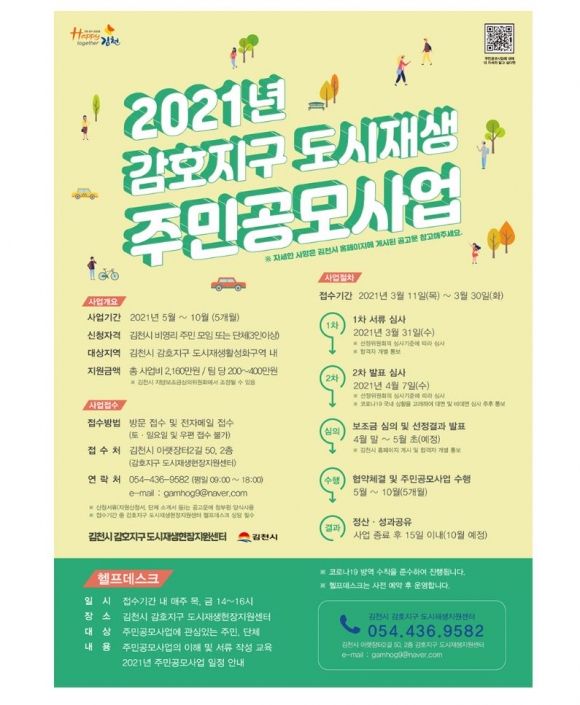 김천시(시장 김충섭)는 감호지구 도시재생에 대한 이해와 참여를 높이고 지역공동체를 활성화하기 위해 ‘2021년 감호지구 도시재생 주민공모사업’을 추진한다고 밝혔다.이번 공모사업은 감호지구 도시재생 및 공동체 활성화 등에 적합한 사업을 직접 제안하고 실행하여 도시재생사업에 대한 이해와 참여 기회 제공, 마을공동체 역량 강화, 지속 가능한 도시 기반 구축을 위한 도시재생 뉴딜사업으로 김천시 소재 3인 이상으로 구성된 비영리 주민 모임 또는 단체가 참여할 수 있으며, 총사업비 2,160만원으로 사업당 최소 200만원 ~ 최대 400만원을 지원한다.이번 공모사업의 접수 기간은 이달 30일까지이며 원활한 공모 접수를 돕기 위해 감호지구 도시재생현장지원센터에서 접수기간 내 매주 목, 금요일 오후 2시 ~ 오후 4시까지 헬프데스크를 운영할 예정이다.김천시 관계자는 “지역 자원을 활용해 주민들의 자발적인 참여와 새로운 아이디어로 지역 문제를 함께 해결할 수 있는 소통의 계기가 되기를 바란다”라고 말했다.한편 감호지구 도시재생 뉴딜사업은 지난 2020년 4월 승인ㆍ고시되었으며 국비 141억 을 포함 총 263억원 투입하여 2024년 사업준공을 목표로 해피러닝어울림플랫폼, 정정당당 은빛복지센터, 보행자 안전 우선도로 및 공영주차장 조성 등을 통해 주민들의 삶의 질 향상과 도심기능 회복 및 지역경제 활성화를 추진하는 사업이다.