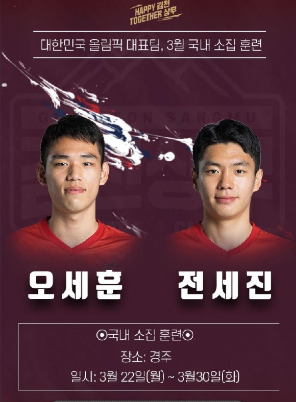 대한축구협회는 15일, 김학범감독이 이끄는 올림픽 대표팀 명단을 발표했다. 소집 선수 26명 중 김천상무프로축구단(대표이사 배낙호) 오세훈, 전세진이 이름을 올렸다. 김학범 감독이 이끄는 U-23 대표팀은 오는 22일부터 30일까지 경주에서 훈련을 진행한다. 올해 1월 소집 이후 두 달 여 만에 재 소집된 오세훈은 “국군대표선수로서 올림픽 대표로 다시 선발돼 영광이다. 올림픽이 다가오는 만큼 더욱 실력을 갈고닦아 좋은 모습을 보이도록 하겠다. 반드시 올림픽에 출전할 수 있도록 최선을 다하겠다”는 각오를 밝혔다. 오세훈과 함께 재 발탁된 전세진은 “지난 1월 소집 이후 동료와 함께 다시 발탁돼 정말 영광이다. 나라를 대표하는 선수로서 좋은 모습을 보이고 돌아오도록 하겠다. 최종 명단까지 발탁돼 국위선양을 하고 돌아올 수 있도록 최선을 다하겠다”고 각오를 전했다.