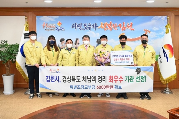김천시(시장 김충섭)는 경상북도 주관 2020년 지방세 체납정리 시군평가에서 최우수 기관으로 선정되어 6천만원의 특별조정교부금을 받게 되었다.경북도는 지난해 시군의 적극적인 지방세 체납액 징수 동기 부여를 위한 인센티브 지급계획을 수립하여 도내 23개 시군에 대해 체납세 징수율 제고를 위한 동기부여를 유도하였다.김천시는 2020년 지방세 체납액 210억 가운데 99억을 징수하고 20억을 결손처분하는 등 총 119억원을 정리하여 체납액 정리율 56.7%의 사상 최고실적을 거양함과 동시에 도내 시부 체납액 정리율 1위를 달성하였다.김천시는 이번 시군평가 기준으로 제시된 이월체납액 징수율, 현년도분 징수율, 결손율, 행정제재 등에서 모두 수위의 평가를 받아서 경북도 전체 지방세 체납액 감소와 도의 보통교부세 패널티 감소에도 기여하게 되었다.이정하 세정과장은 체납세 납부는 재정건전성 확보를 통한 지방자치단체 존립의 기반이 될 뿐 아니라, 조세정의 차원에서 반드시 추진되어야 할 과제이므로 지속적으로 체납자에 대해서는 강력한 징수활동을 전개할 것이므로, 체납이 있는 시민들은 체납세 자진납부에 동참하여 줄 것을 당부하였다.