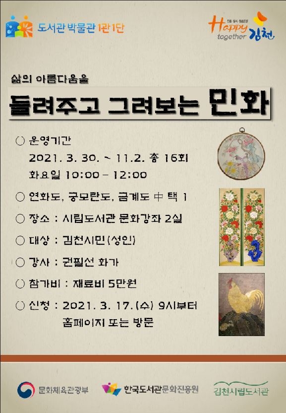 김천시(시장 김충섭)가 문화체육관광부가 주최하고 한국도서관문화진흥원이 주관하는 ‘2021년 도서관·박물관·미술관 「1관 1단」’ 사업에 선정돼 3월 30일부터 본격적으로 사업을 추진한다고 밝혔다.‘1관1단’ 사업은 도서관·박물관·미술관을 거점으로, 지역 주민의 창의적 문화·예술 동호회 활동을 지원하는 사업니다.2차에 걸친 심사를 통해 「1관 1단」 사업에 선정된 기관은 동호회 활동과 운영에 필요한 예산을 전액 국비 지원받는다. 김천시립도서관은 ‘들려주고 그려보는 민화’라는 주제로 김천시민을 대상으로 민화에 대해 배우고 작품을 만들어 전시하는 동호회 활동을 적극적으로 지원할 계획이다.프로그램은 오는 3월 30일(화)부터 11월 2일(화)까지 총 16회에 걸쳐 운영되며, 세부내용과 참가자 모집에 관한 사항은 김천시립도서관 홈페이지를 참조하거나 사서팀(☎054-421-2844)으로 문의하면 된다.백선주 시립도서관장은 “2021년 처음 선정된 공모사업 프로그램인 「1관 1단」사업으로 김천 시민들에게 우리 전통 그림인 민화의 가치에 대해 느낄 수 있게 하며, 삶의 아름다움을 더해줄 문화생활을 향유할 수 있는 기회가 될 것으로 많은 시민들의 관심과 참여를 바란다.”고 전했다.