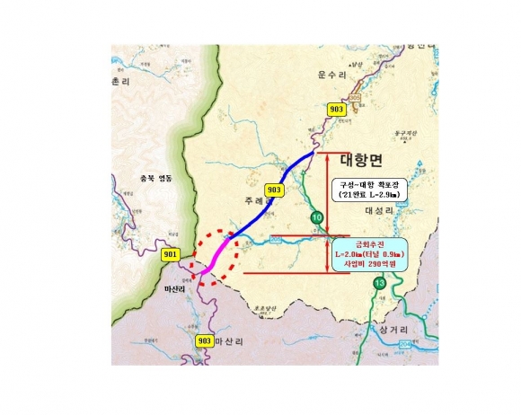 김천시(시장 김충섭)가 간선도로의 기능제고와 순환도로로서의 역할을 위해 지속 건의한 지방도903호(대항면 주례리 ~ 구성면 마산리) 연결 도로가 가시적인 성과를 보이고 있다.경상북도에서는 금년 “구성~대항간 도로건설공사 기본 및 실시설계용역”을 착수하여 단절된 지방도를 잇는다는 계획이다.지난 2015년부터 2021년 까지 약112억원의 도비를 투입해 개설한 대항면 주례리 일원 도로사업은 총 연장 2.9㎞에 2차로 도로로 현재까지 도로와 도로가 연결 되지 못한 반쪽짜리 도로로서 김천시에서는 지방도간 연결을 지속적으로 건의 해 왔었다.김천시 관계자에 따르면 본 도로 연결노선은 생태자연 1등급에 해당하는 백두대간 축으로 환경영향평가 등 행정 협의의 어려움과 안전한 도로 이용을 위한 도로경사를 감안할 시 난공사가 예상되어 검토 과정에서 상당한 어려움이 있을 것으로 생각한다고 말했다.