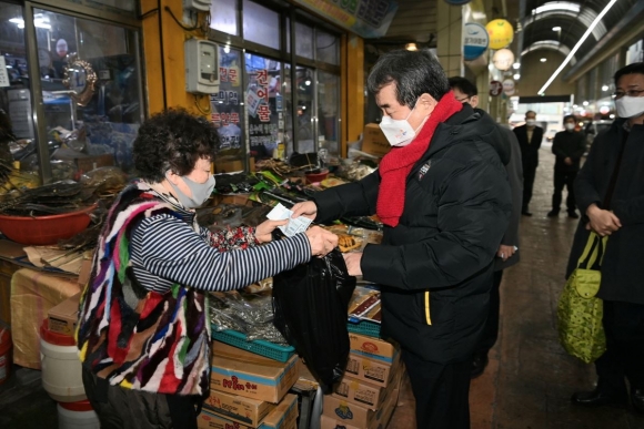 김충섭 김천시장은 평화시장, 중앙시장, 황금시장을 방문해 설맞이 전통시장 장보기에 앞장서며 지역경제 활성화를 위한 2022년 첫 민생행보에 나섰다.김충섭 시장은 25일 평화․중앙․황금시장을 차례로 방문해 제수 용품 등을 직접 구매하고 시장을 찾은 시민들을 만나 전통시장 이용에 대한 감사 인사도 전했다.