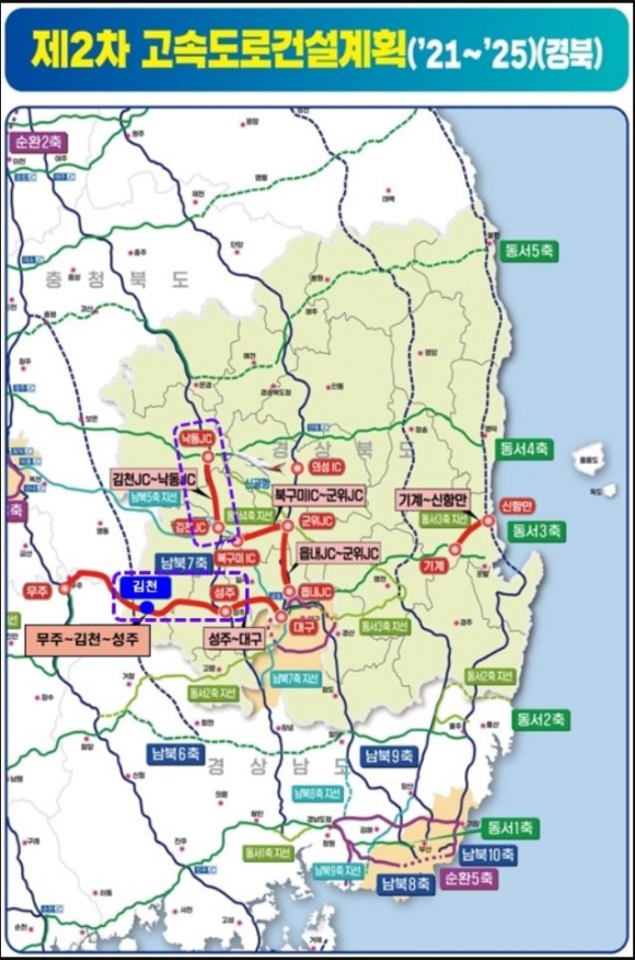 국토교통부는 28일 고속도로 계획의 최상위 계획인 「제2차 고속도로 건설계획」을 도로정책심의위 의결을 통해 확정했다.이번 노선에는 김천시가 지속적으로 건의해온 “무주~김천~성주” 연결 고속도로가 반영되어 향후 예비타당서 조사를 거쳐 사업을 시행하게 되었다.또한 상습정체 및 사고다발구역인 “김천 분기점에서 낙동 분기점”간 중부내륙선도 4차로에서 6차로로 확정 반영 되었다.“무주~김천~성주”간 고속도로는 총연장 68.4㎞ 구간에 총사업비 3조4천억원을 투입할 계획이고, “김천 분기점에서 낙동 분기점”간 중부내륙고속도로 확장사업은 총연장 24㎞ 구간에 총사업비 4천8억원이 투입되는 대형사업이다.김천시는 “무주~김천~성주”간 고속도로가 관내를 통과함에 따라 지역민들의 고속도로 이용 편리성을 위해 신설IC를 적극 건의한다는 방침이다.이번 국토교통부 발표에 대해 김충섭 김천시장은 고속철도 사업에 이어 고속도로 사업에도 김천시가 주요 경과노선으로 지정되어 김천시 남부지역의 균형발전 기반을 마련하게 되어 큰 의미가 있다고 말했으며, 그간 노선 반영을 위해 중앙부처에서 함께 노력해주신 지역구 송언석 국회의원에게도 감사의 말을 전했다.