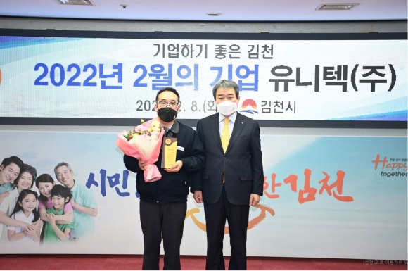 김천시(시장 김충섭)는 2월 이달의 기업으로 유니텍㈜(대표 권오익)을 선정한 가운데 8일 김천시청에서 선정패 전달 및 회사기 게양식을 가졌다.