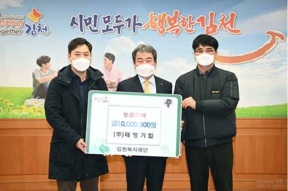 주식회사 태형기업(대표 김태균)이 코로나19 확산세에 따른 경기침체 등의 극복 의미를 담아 김천복지재단에 1,000만원의 기부금을 전달했다.지난 8일 김충섭 김천시장, 김태균 대표, 박호영 소장이 참석한 가운데 열린 기부금 전달식에서 김태균 대표는 “관내 업체로서 코로나19로 인한 경기 침체와 고용 불안정에 대한 고통과 손실을 공감한다”며 “이번 기부금이 코로나19 극복에 힘써주시는 김천시 모든 분들과 도움이 필요한 복지취약계층에 작게나마 위로와 희망이 되어서 하루빨리 코로나19 사태를 극복할 수 있기를 바란다”고 말했다.김태균 대표가 이끄는 주식회사 태형기업은 현재 김천시 남면 소재의 아스팔트 콘크리트 및 혼합제품 제조업체로, 도내 건설 인프라 사업뿐 아니라 자원 순환을 선도하는 기업으로서 김천시에 이바지하고 있다.김충섭 김천시장은 “코로나19 사태의 장기화로 인해 어수선하고도 모두가 어려운 이 상황에서 좋은 의미를 담아 기부금을 전달해준 김태균 대표님 이하 태형기업 직원들에게 감사드린다”며 “전달받은 기부금은 복지재단을 통해 더불어 살아가는 행복공동체 김천을 선도하는 데 쓰도록 하겠다”고 밝혔다.