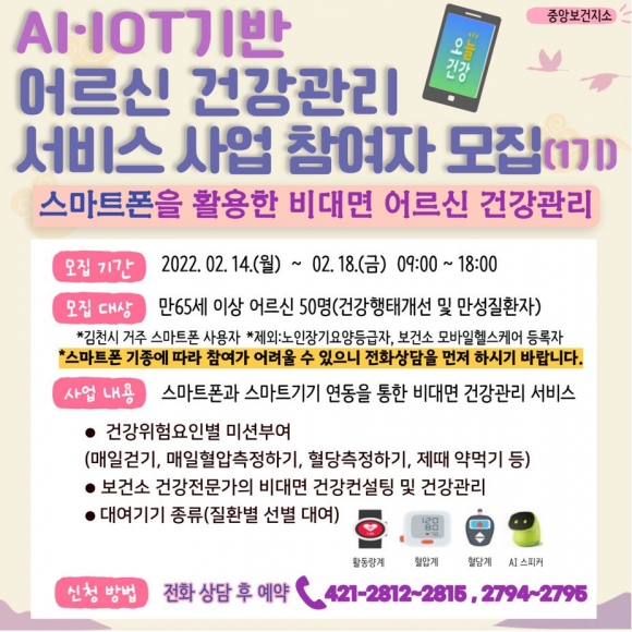 김천시는 2021년 보건복지부가 추진하는 AI·IOT기반 어르신 건강관리 서비스 시범사업에 선정되어 만65세 어르신 중 본인명의 스마트폰 소지자 중 1기 사업 참여자 50명을 선착순으로 모집한다.AI·IOT기반 어르신 건강관리 서비스 사업은 스마트폰과 스마트 기기를 연동한 비대면 대상별 맞춤형 건강관리 서비스를 제공한다.김천시민 중 만성질환자나 건강행태 개선이 필요한 만65세 어르신 중 스마트폰을 소지하고 사용이 가능하면 참여할 수 있으나, 스마트 기종에 따라 사업이 불가 할 경우가 있어 전화 상담 후 예약을 진행 해야만 한다.선정된 대상자는 사전 건강 스크리닝을 한 후 보건소에서 제공(대여)되는 스마트 기기(손목형 활동량계, 블루투스 혈압계, 블루투스 혈당계)와 스마트폰 앱 오늘건강에 연동 시켜 대상자 스스로 건강 체크를 하면 그 결과가 보건소 전문가(간호사, 물리치료사 등)에게 전송되어 건강 컨설팅 및 교육을 제공하는 사업이다. 사업 기간은 6개월이고 기간 중 대상자별 차등하게 부여되는 미션을 수행해야 하고 미션 성공 점수에 따라 소정의 인센티브를 제공받을 수 있다.장재근 보건소장은 “AI·IOT기반 어르신 건강관리 서비스 사업을 통해 어르신들의 자가 건강관리 능력을 키우고 미션 성공에 따른 성취감도 느껴 삶의 활력을 찾길 바란다”라고 말했다.