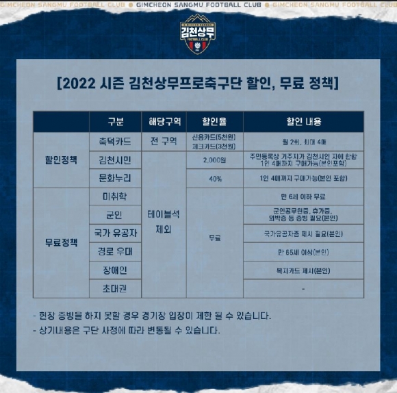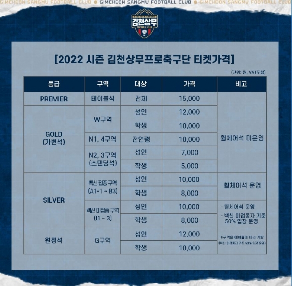김천상무프로축구단이 11일 2022 시즌 입장권 운영 계획을 발표했다. 김천상무는 백신 접종자 구역(100% 개방), 미 접종자 구역(50% 개방)을 나눠서 운영하며 입장 가능한 전체 인원은 6,865명이다.김천상무는 백신 접종자 구역과 백신 미 접종자 구역을 나눠서 운영한다.