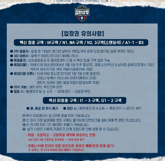 가변석 예매자는 가변석 출입구, 동문을 통해 입장 가능하다. 일반석 접종자 구역(A-1, B구역) 예매자는 외 7문을, 일반석 미 접종자 구역(I구역) 예매자는 외 2문으로 입장할 수 있다. 원정석(G구역) 예매자는 외4문으로 입장 가능하다.전 좌석은 온라인 예매만 가능하며 경기 당일 현장 구매는 불가능하다. 만 65세 이상(1957년생까지) 및 장애인에 한해서만 현장 구매 및 전화 예매(1588-7890)가 가능하다.한편, 김천상무는 오는 27일 2시 김천종합운동장에서 열리는 ‘하나원큐 K리그1 2022’ 포항스틸러스와 홈 개막전 경기 입장 티켓을 17일 티켓링크를 통해 오픈한다. 입장권 정책과 관련된 자세한 사항은 김천상무 공식 홈페이지 및 구단 SNS를 통해 확인할 수 있다.