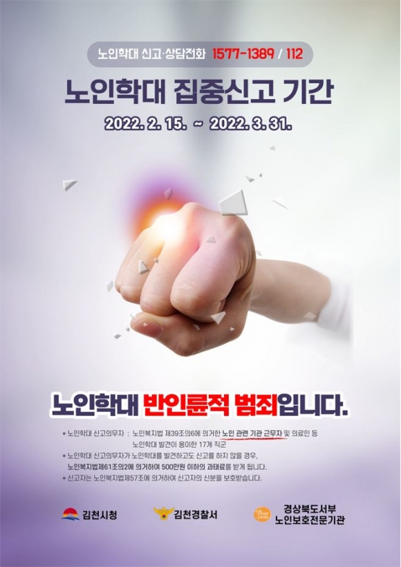 김천시(시장 김충섭)는 노인학대에 대한 관심제고와 예방을 위해 2022. 2. 15.~ 3.31.까지「노인학대 집중신고기간」을 운영한다.2021년 12월 관내 노인주간보호시설에서 발생했던 노인학대와 같은 사건의 재발 방지와 노인학대에 보다 적극적으로 대응하고 시설장과 종사자 뿐 만 아니라 시민들의 인식과 관심을 이끌어내기 위해, 김천경찰서 및 노인보호전문기관과 협조를 통해「노인학대 집중신고기간」운영하게 되었다.노인학대는 노인에 대한 신체적·정서적·성적 폭력 및 경제적 착취 또는 가혹행위를 하거나 유기 또는 방임하는 것으로 노인복지법에서는 노인을 상해, 폭행, 성폭행·성희롱, 유기·방임, 구걸을 하게 하거나 노인을 이용하여 구걸하는 행위 등에 대해서는 금지행위로 규정하고 처벌 또한 엄중하다.노인학대는 피해사실을 숨기거나 신고를 꺼리는 경향이 있어 쉽게 발견되지 않기 때문에, 무엇보다 주변에서의 관심과 신고가 매우 중요하고, 당사자인 노인도 참지 말고 초기단계에서부터 적극 대응하는 것이 중요하다.김충섭 김천시장은 “노인학대는 반인륜적인 범죄행위입니다. 시민 모두가 집중 신고기간뿐만 아니라 언제든지 주변의 노인들에게 관심을 가지고 노인을 존중하고 노인 인권 보호를 위해 노력해 달라. 김천시에서도 유관 기관과의 긴밀한 공조체계를 통해 노인학대 예방을 위해 최선을 다하겠다.”고 전했다.