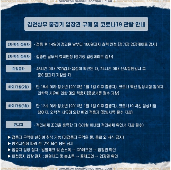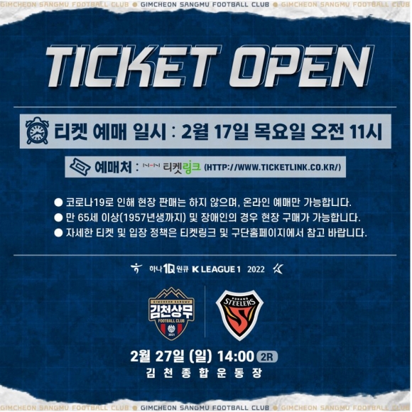 김천상무프로축구단(대표이사 배낙호)이 17일 오전 11시, 온라인 예매 사이트 티켓링크를 통해 27일 오후 2시, 김천종합운동장에서 열리는 ‘하나원큐 K리그1 2022’ 2R 포항스틸러스와 홈 개막전 예매를 시작한다.김천상무는 백신 접종자 구역과 백신 미 접종자 구역을 나눠서 운영한다. 백신 접종자 구역은 테이블 석, 가변석, 일반석(B구역)이며 거리두기 없이 100% 개방하고 취식도 가능하다.